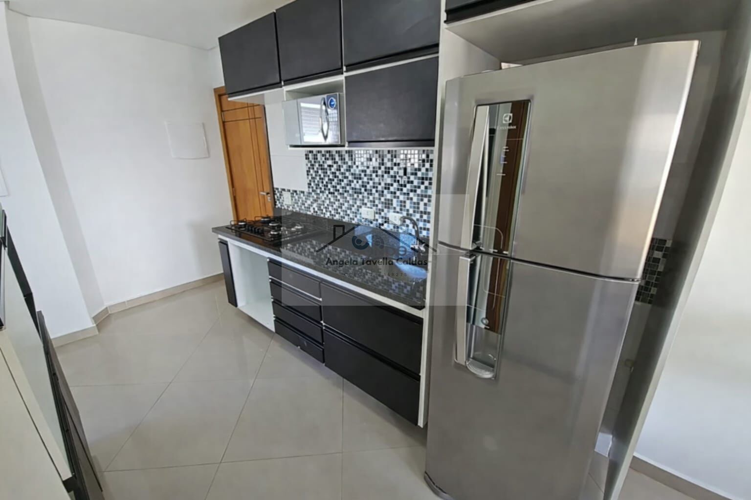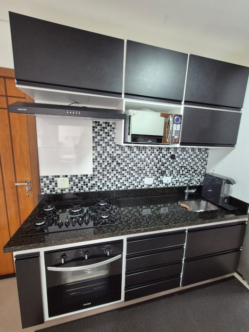 Cozinha com armários, equipada com cooktop, forno e micro-ondas.
